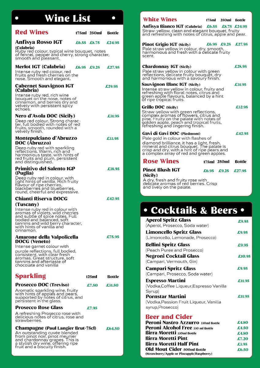 To accompany your meal, Il Laghetto offers a range of beverages, including classic Espresso, Cappuccino, and Caffè Latte. For something more refreshing, there are Coke, Fanta, and J20 soft drinks. A carefully selected wine list includes both red and white wines such as Merlot Igt and Pinot Grigio Igt, while the Prosecco and Champagne add a celebratory touch to your dining experience.